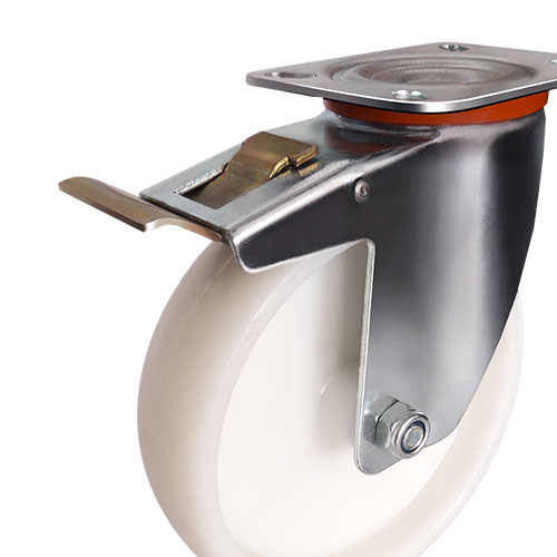 Поворотное колесо из полиамида с поворотным кронштейном и тормозом диаметром 200 мм. Для крепления к оборудованию используется стальной оцинкованный кронштейн с платформой размером 115x141 мм. Межосевое расстояние 80x105 мм. Обод колеса шириной 50 мм обеспечивает устойчивость. Грузоподъемность 230 кг. Ножной тормоз-педаль фиксирует колесо во время стоянки. Рекомендуется использовать на ровных и гладких полах. Устанавливаются в медицинские, платформенные тележки и оборудование, технику для пищевой промышленности.