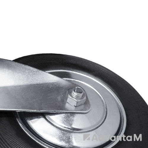 Промышленное поворотное колесо серии SС – одно из самых востребованных в серии. Обод, поворотный кронштейн, площадка и защитные диски из оцинкованной стали, устойчивой к коррозии. Ширина обода 36 мм. Материал шинки – чёрная литая резина, обеспечивающая тихое и плавное движение. Роликовый подшипник в ступице защищен от попадания пыли специальными колпаками.