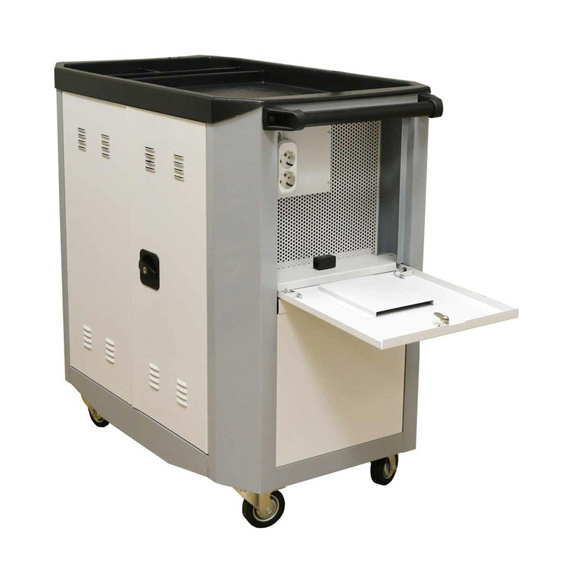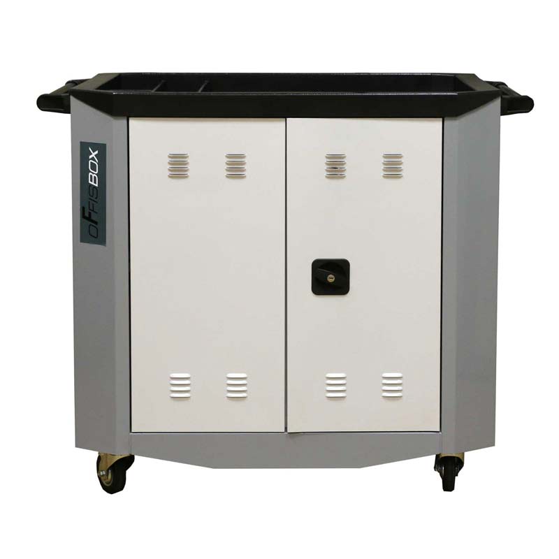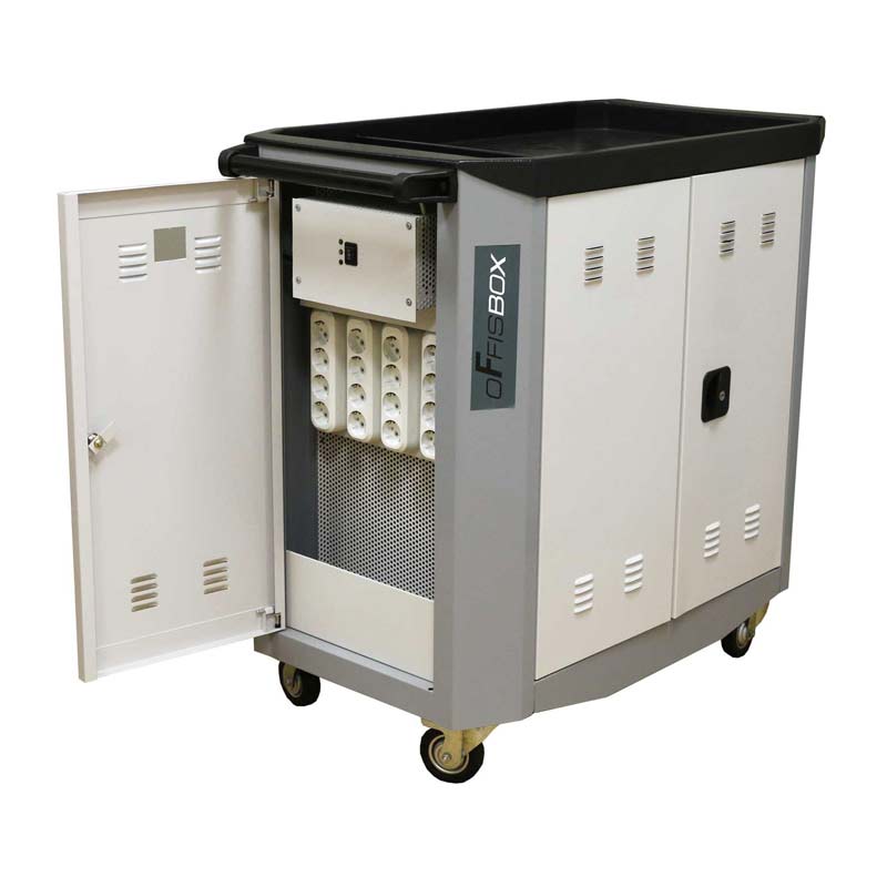 Тележка Offisbox предназначена для зарядки и хранения ноутбуков и сформирована на базе металлического корпуса. Внутри корпуса размещены две полки которые разделены перфорированной перегородкой на четыре отделения. Два отделения снабжены сетчатыми перегородками и предназначены для хранения ноутбуков. Сетчатые перегородки съемные, позволяющие оптимально организовать внутреннее пространство, при количестве ноутбуков менее 16 штук. Максимальное количество ноутбуков по 8 штук на каждой полке.