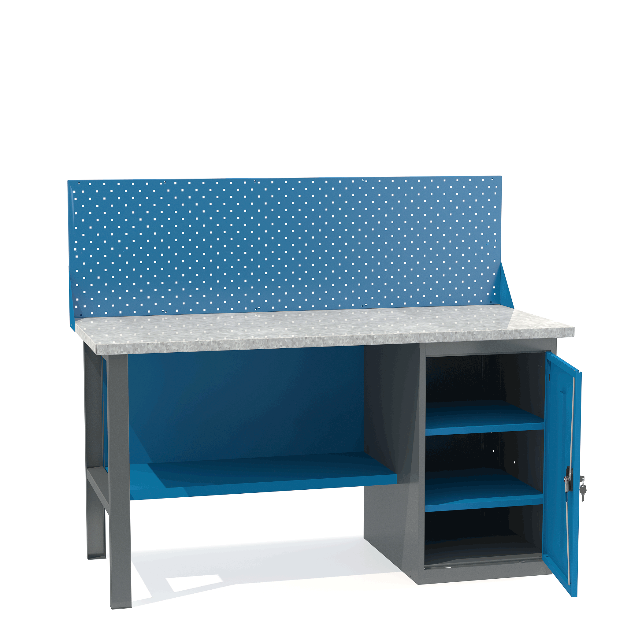 - Верстак укомплектован тумбой с полками.