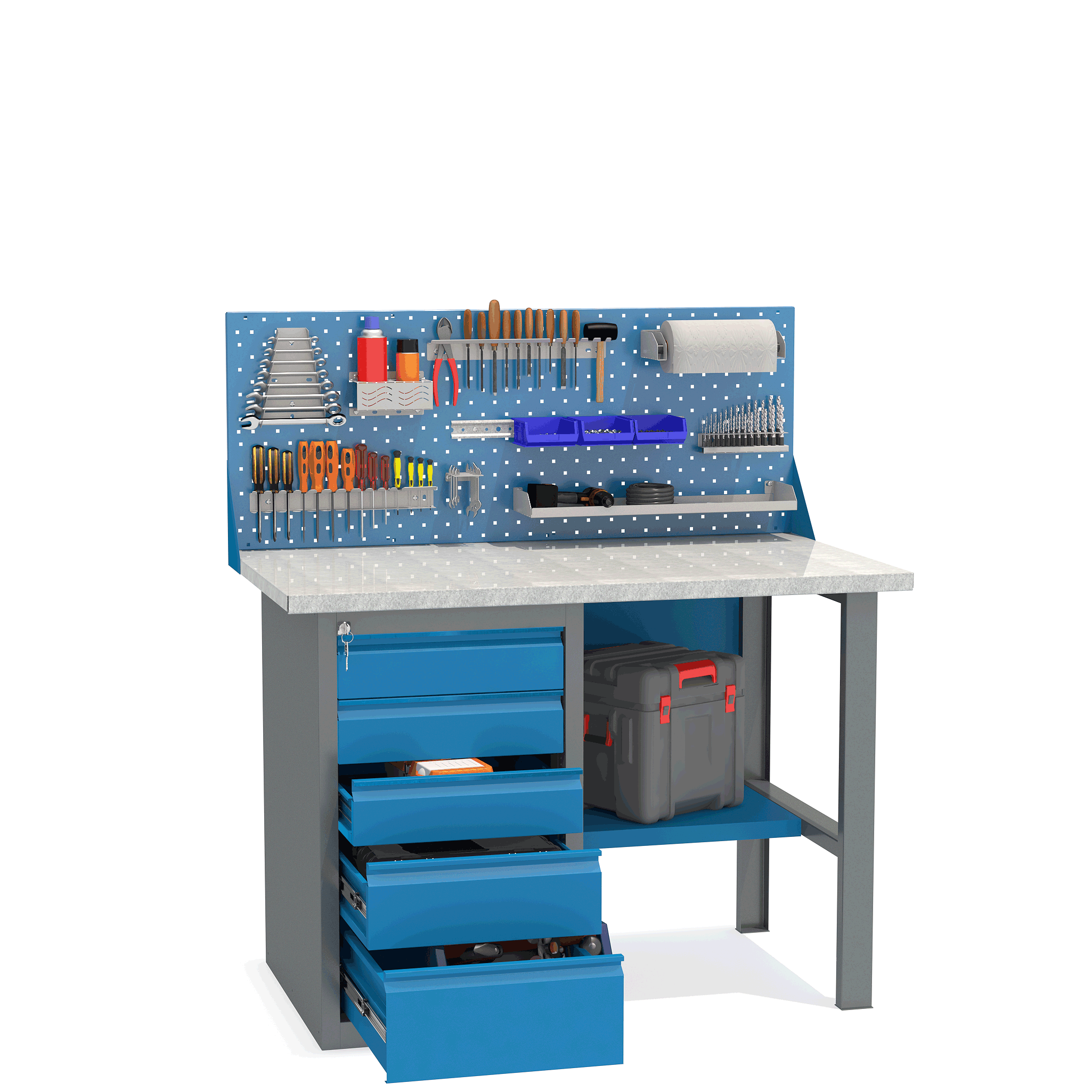 - Верстак укомплектован драйвером с пятью выдвижными ящиками разными по высоте и тумбой с полками.