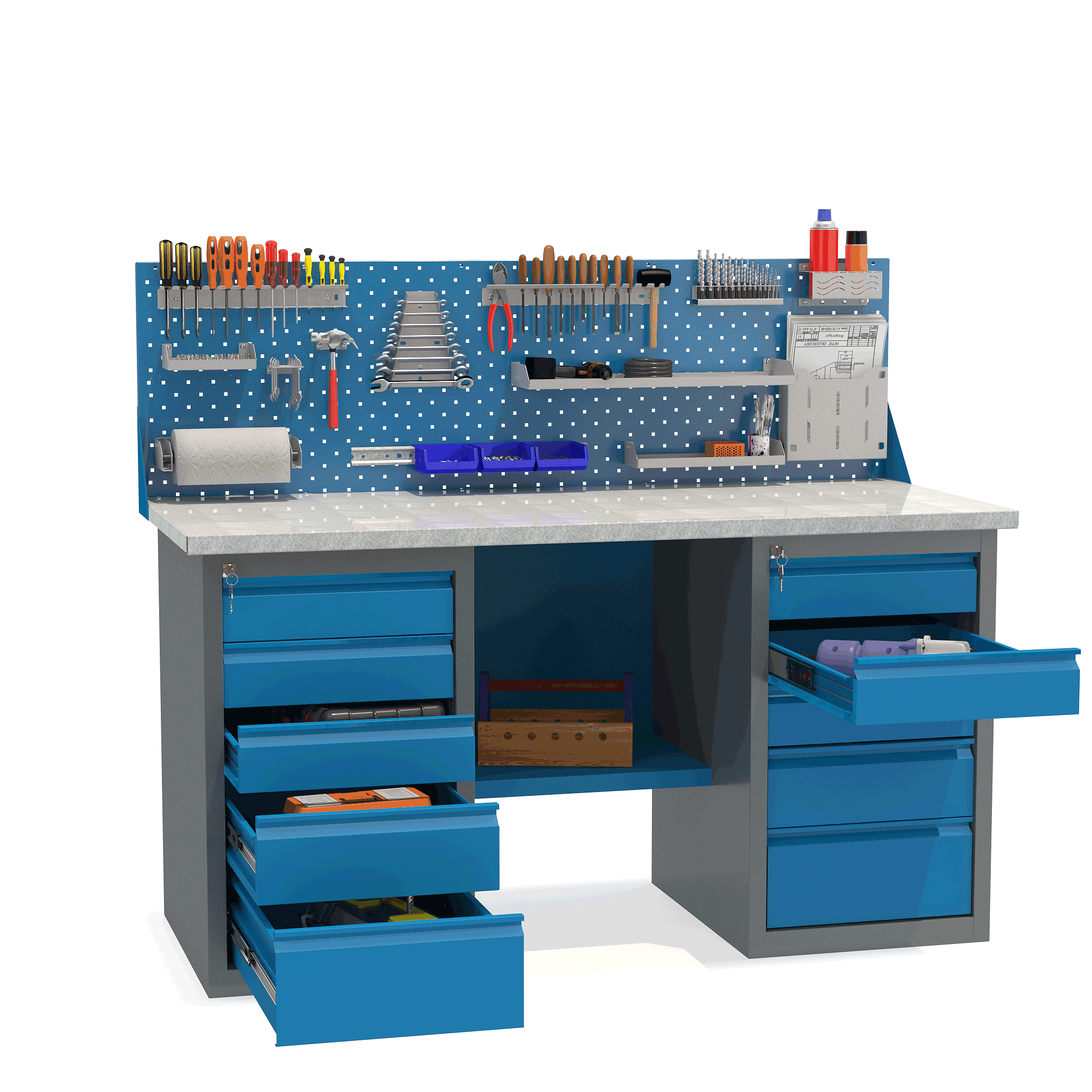 - Верстак укомплектован двумя драйверами, каждый из которых оснащен пятью выдвижными ящиками разными по высоте.