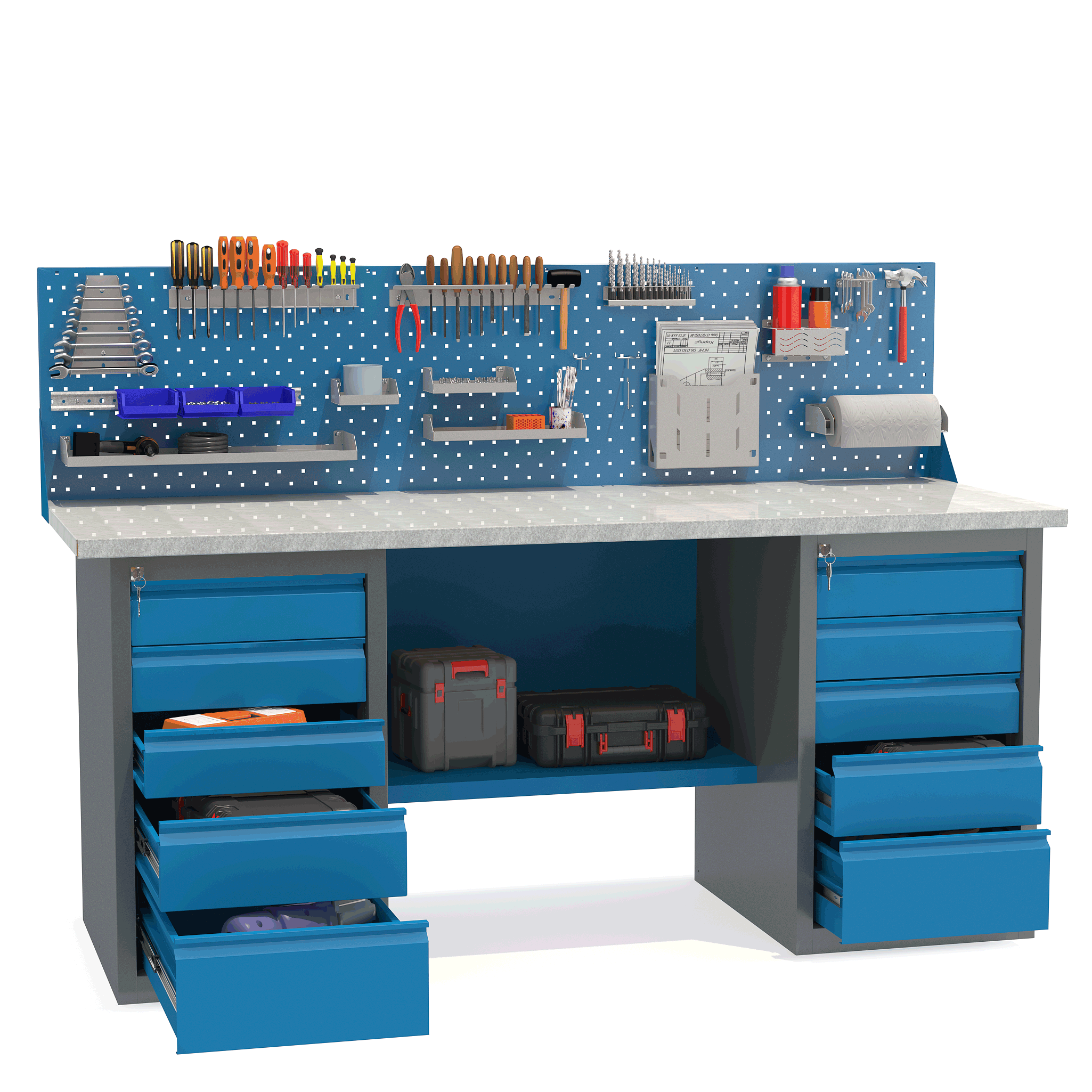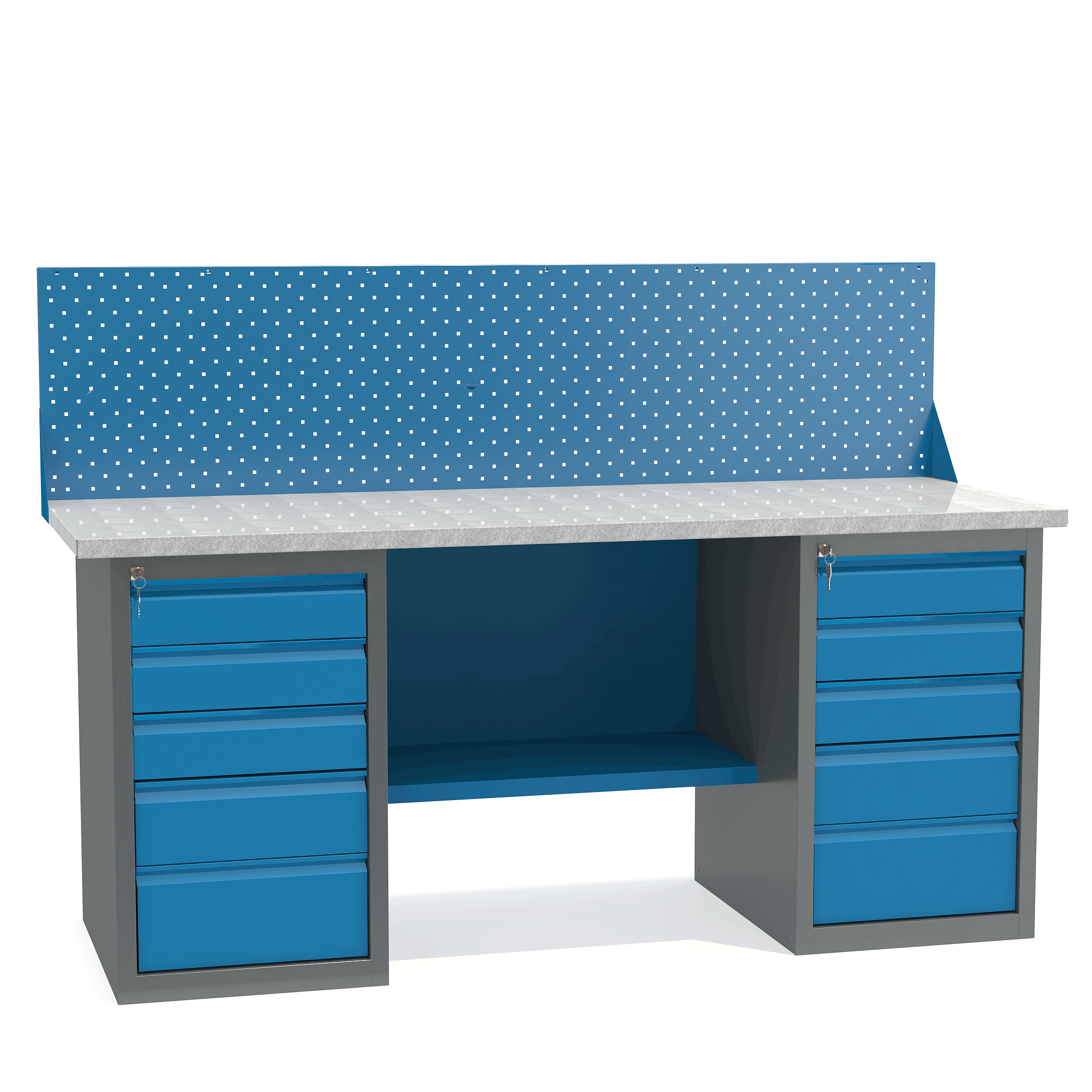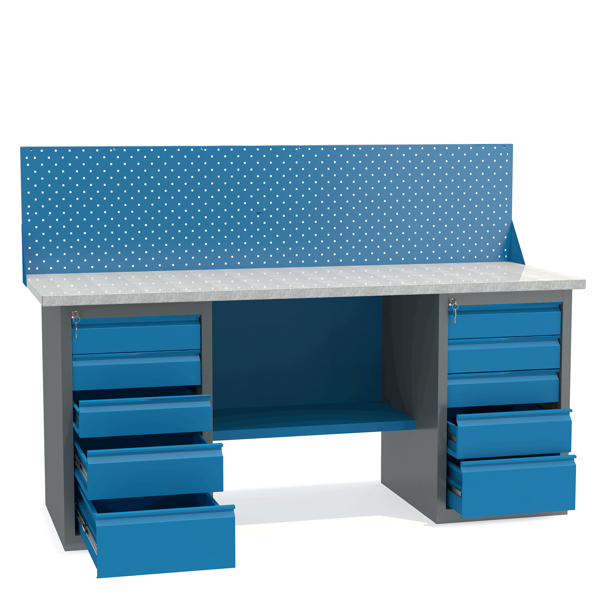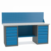 - Верстак укомплектован двумя драйверами, каждый из которых оснащен пятью выдвижными ящиками разными по высоте.