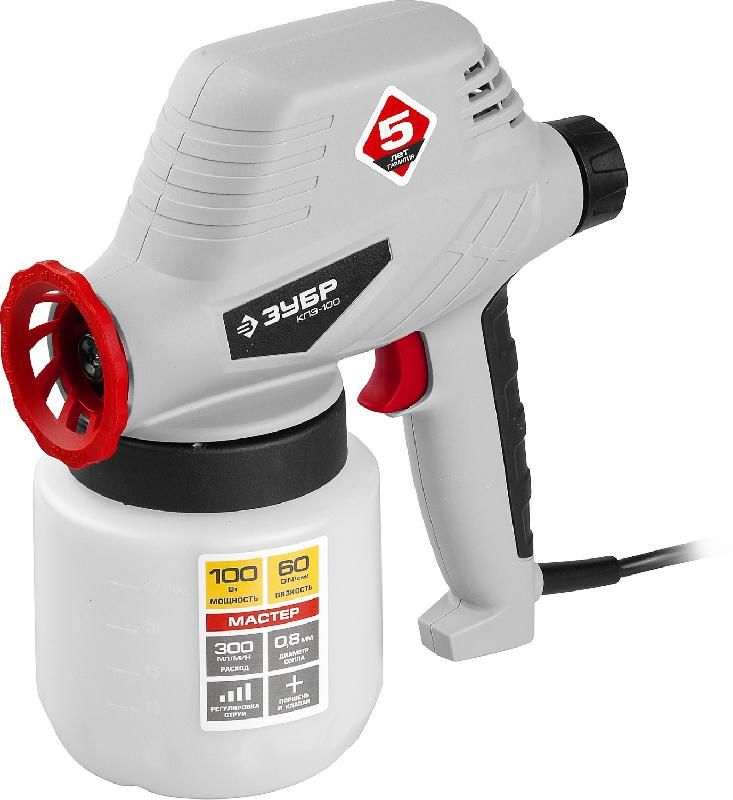 • Краскопульт (краскораспылитель) электрический, ЗУБР КПЭ-100, 0.8 л, краскоперенос 0-300мл/мин, вязкость краски 60 DIN/сек, сопло 0.8мм, 100Вт