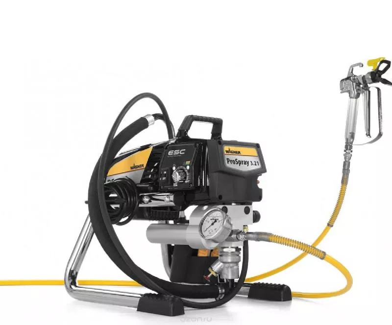 Окрасочный агрегат Wagner ProSpray 3.21, поршневой покрасочный агрегат безвоздушного распыления высокого давления с электрическим двигателем на 220 В, легкий, компактный, предназначен для использования при строительстве зданий и сооружений, для нанесения финишных и грунтовочных покрытий, побелки, водоэмульсионки. Благодаря небольшому весу этот окрасочный агрегат удобно использовать при производстве работ по окраске в промышленном альпинизме.