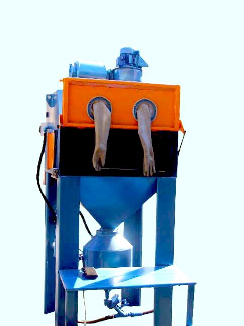 Камеры струйной очистки типа КСО. Абразивоструйные камеры бывают инжекторного и напорного типа. В камерах инжекторного типа КСО - воздух и абразив подаются по двум разным рукавам. Воздух по рукаву подается непосредственно в соплодержатель, в котором установлены два сопла: абразивоструйное и воздушное. Между соплами создается разряжение, за счет которого происходит подсос абразива. Скорость и энергия воздушно-абразивной струи при инжекторном типе значительно ниже, чем в напорном, что удовлетворяет при небольших объемах работ.