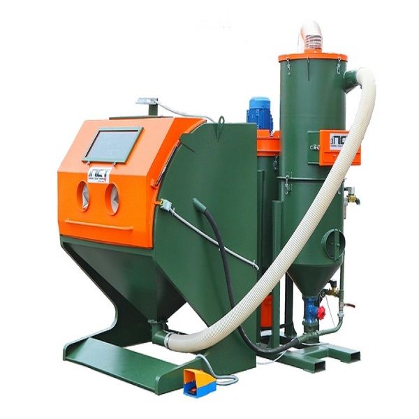 Камеры струйной очистки типа КСО. Абразивоструйные камеры бывают инжекторного и напорного типа. В камерах инжекторного типа КСО - воздух и абразив подаются по двум разным рукавам. Воздух по рукаву подается непосредственно в соплодержатель, в котором установлены два сопла: абразивоструйное и воздушное. Между соплами создается разряжение, за счет которого происходит подсос абразива. Скорость и энергия воздушно-абразивной струи при инжекторном типе значительно ниже, чем в напорном, что удовлетворяет при небольших объемах работ.