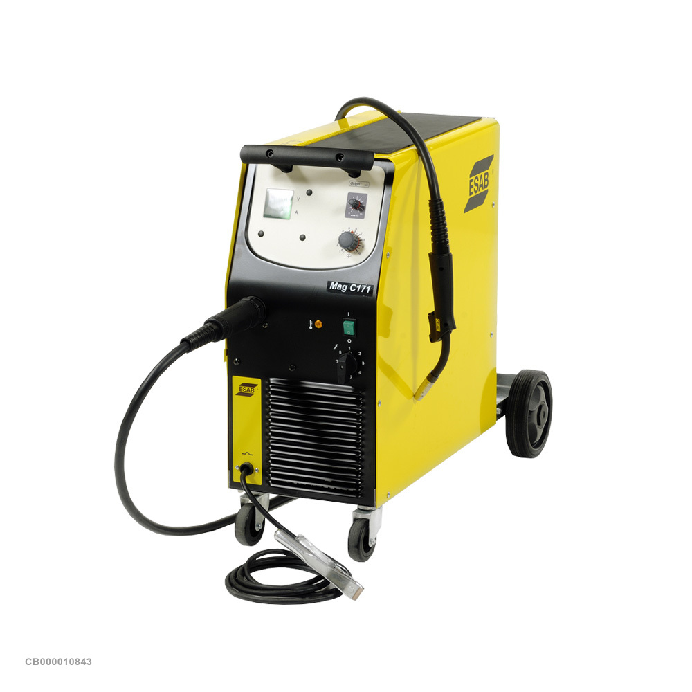 ESAB Origo Mag C171 – профессиональный сварочный полуавтомат питающийся от однофазной сети 220В и работающий в широком диапазоне тока от 30 до 170А. Регулировка тока ступенчатая. Аппарат работает со сплошной стальной сварочной проволокой, проволоки из коррозионно-стойкой стали или из алюминия, а также порошковой проволоки с защитным газом или без него.