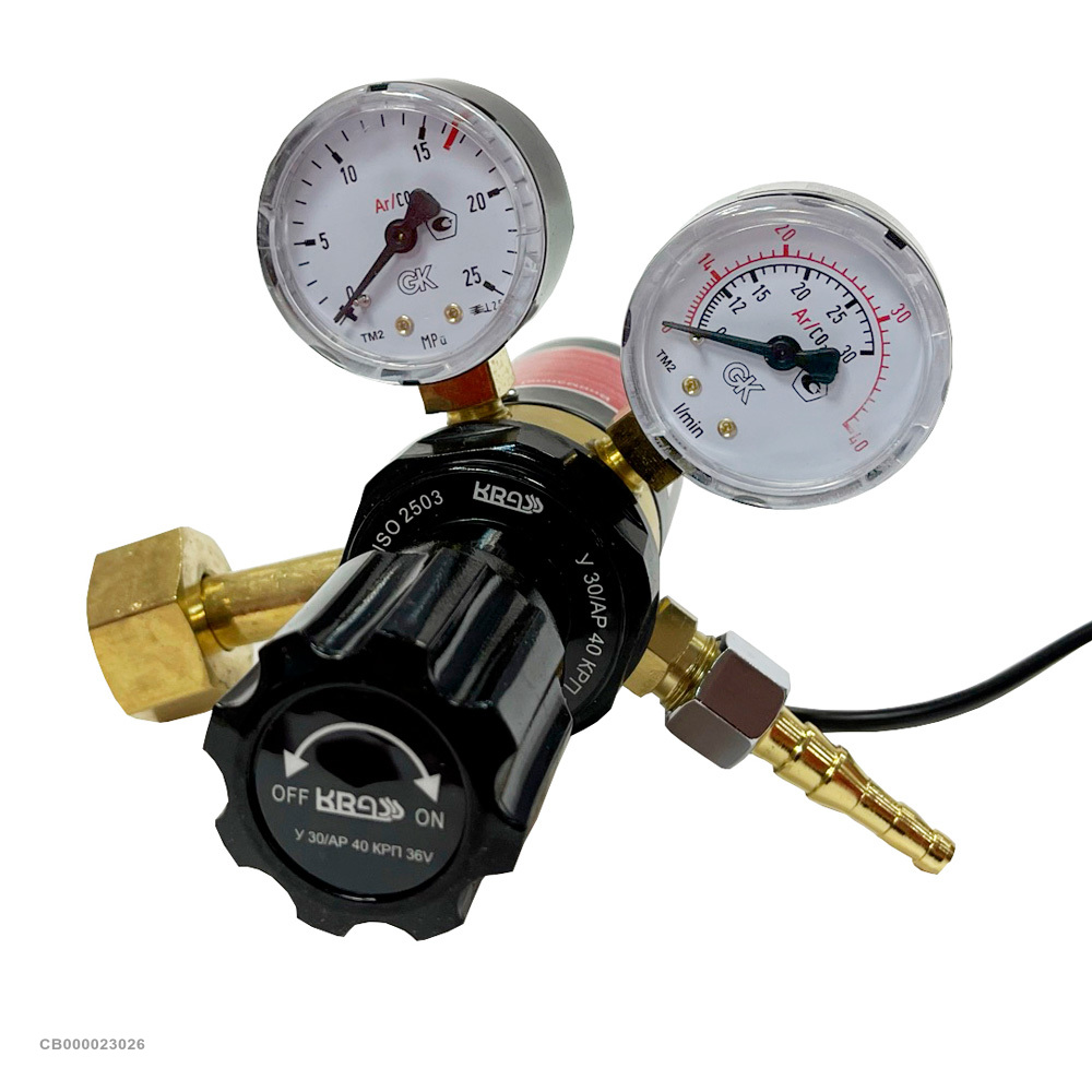 Чтобы избежать окисления металла во время сварки, в рабочую зону подаются инертные газы, но для этого потребуется снизить давление. Газ должен поступать не напрямую из баллона, а через универсальный регулятор У-30/АР-40-КРП. Помимо снижения давления газа, устройство обеспечивает автоматическую подачу газа в рабочую зону. Для этого в конструкции предусмотрен стрелочный расходомер, манометр и подогреватель газа, который работает от сети 220 вольт.