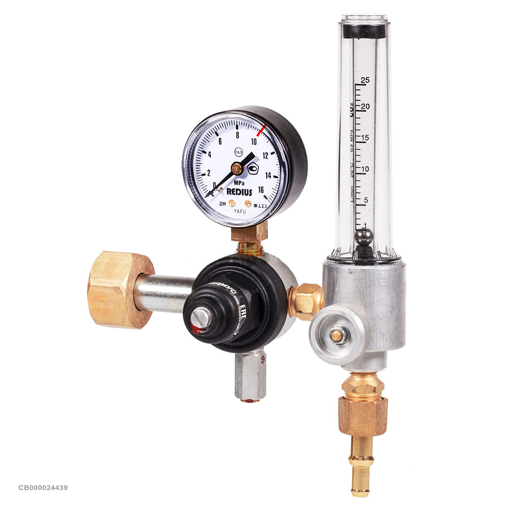 Регулятор поставляется с манометром и ротаметром. На манометре показывается какое давление газа в баллоне, а на ротаметре выставляют требуемую величину расхода (л/мин) с помощью регулировочного вентиля.