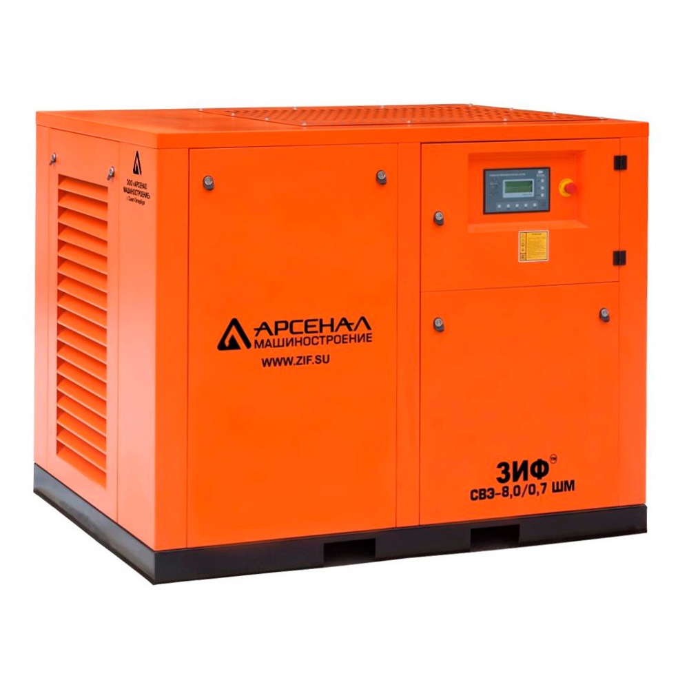Винтовые электрические компрессорные установки ЗИФ-СВЭ серии ШМ (оснащены шумозащитным кожухом и микропроцессорным управлением) и ШМЧ (дополнительно установлен частотный преобразователь частоты вращения двигателя) служат для снабжения сжатым воздухом предприятий любого типа и размера.