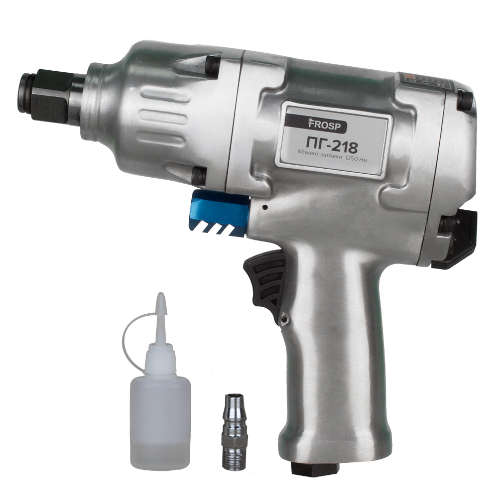 Пневмогайковёрт FROSP ПГ-218 развивает 6000 об/мин при работе на холостом ходу. Масса прибора равна 2,95 кг, а момент затяжки резьбовых соединений соответствует величине равной 1250 Нм. Купить гайковёрт пневматический можно в компании, цена его соответствует уровню изготовления и надёжности в работе.