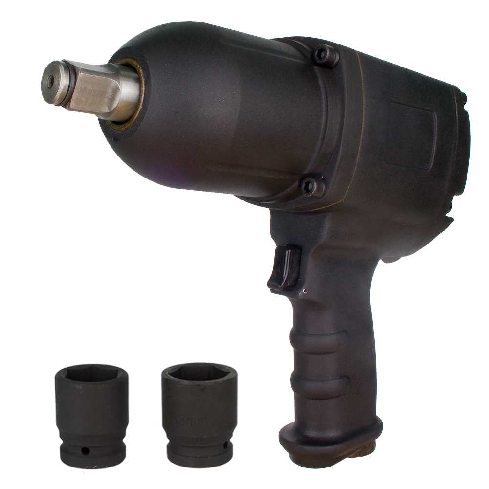 Пневмогайковерт реализуется в кейсе. Гайковерт укомплектован масленкой и двумя торцевыми головками с квадратом шпинделя 3/4 дюйма. Размер головок покупатель вправе выбрать на свое усмотрение, в стоимость комплекта входят любые две головки размером под ключ от 17 до 36 мм.