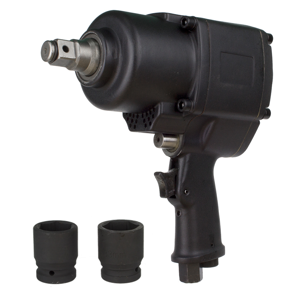 Пневмогайковерт реализуется в кейсе. Гайковерт укомплектован масленкой и двумя торцевыми головками с квадратом шпинделя 3/4 дюйма. Размер головок покупатель вправе выбрать на свое усмотрение, в стоимость комплекта входят любые две головки размером под ключ от 17 до 36 мм.