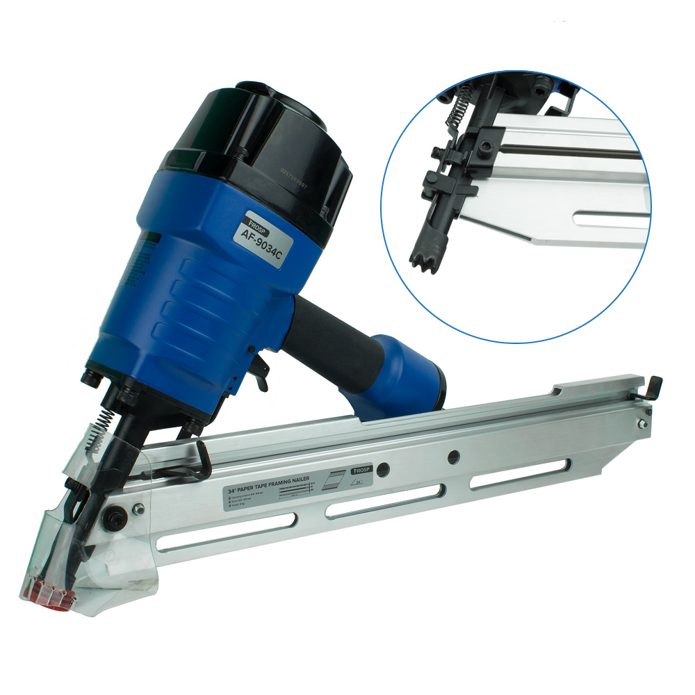 FROSP AF-9034C – реечный пневматический гвоздезабивной нейлер для гвоздей с D-образной шляпкой в бумажной обойме с углом наклона 34 градуса. Применяется для ремонта и изготовления деревянных конструкций. Например, каркасного строительства, изготовления мебели, забора, подиума и других конструкций. Бьёт крепеж длинной 50-90 мм, диаметром 2.87-3.33 мм с ёмкостью магазина 80 гвоздей.