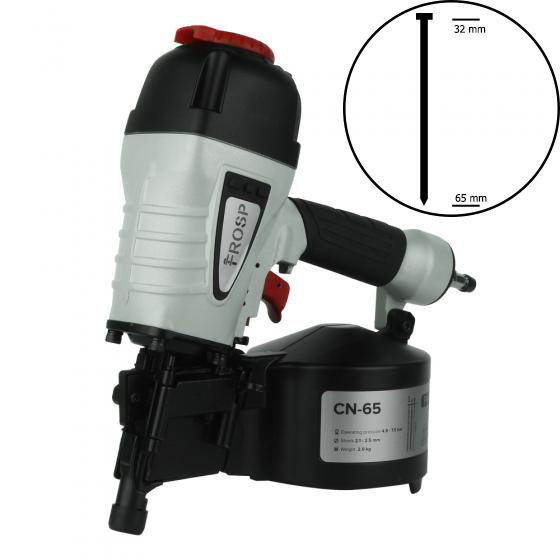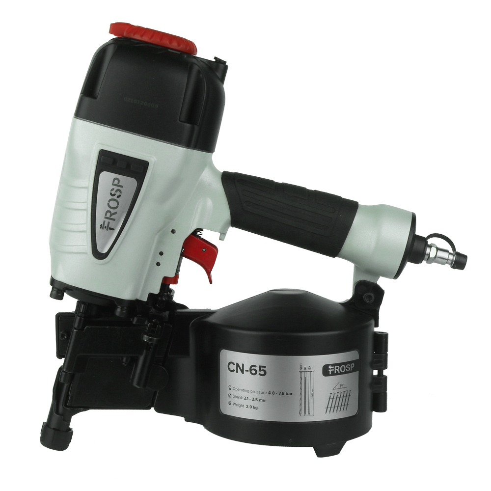 Пневматический барабанный гвоздезабивной нейлер FROSP CN-65 отлично подходит для кровельных работ по дереву, в том числе монтаж мягкой кровли, ремонте и изготовлении других деревянных конструкций. Забивает гвоздь длинной 32-65 мм и диаметром 2,1-2,5 мм. Емкость барабанного магазина 200-300 гвоздей, а угол наклона крепежа 15.